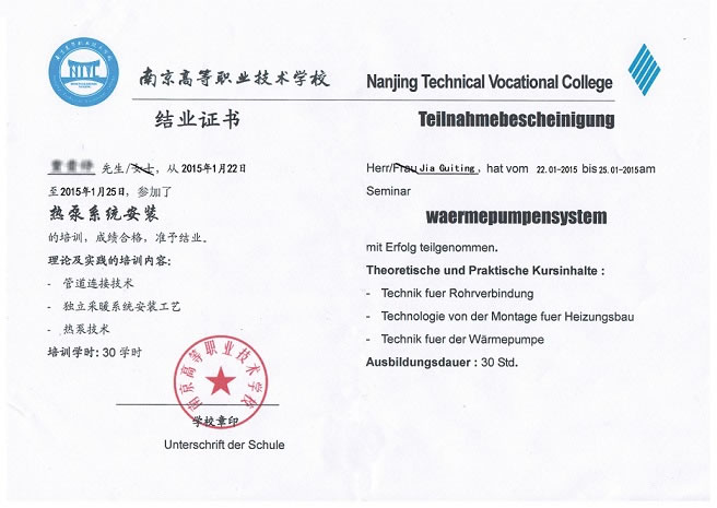 經(jīng)過30學時的培訓,我公司同事獲得南京高等職業(yè)技術學校所頒發(fā)的結業(yè)證書,培訓內容包括空氣能(空氣源)熱泵管道連接技術、獨立采暖系統(tǒng)安裝工藝、熱泵技術等內容,理論與實訓安裝相結合,便于更加全面掌握空氣能(空氣源)熱泵知識。
